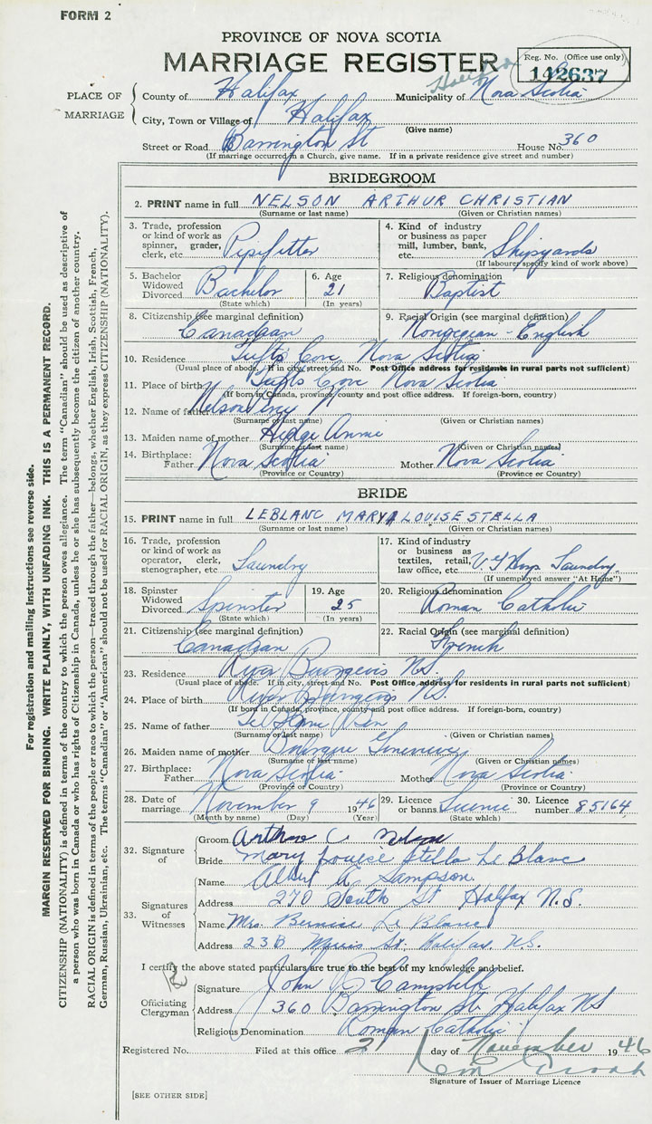 28. Date of marriage November 9 1946 29. By license or banns License 30. License number 85164