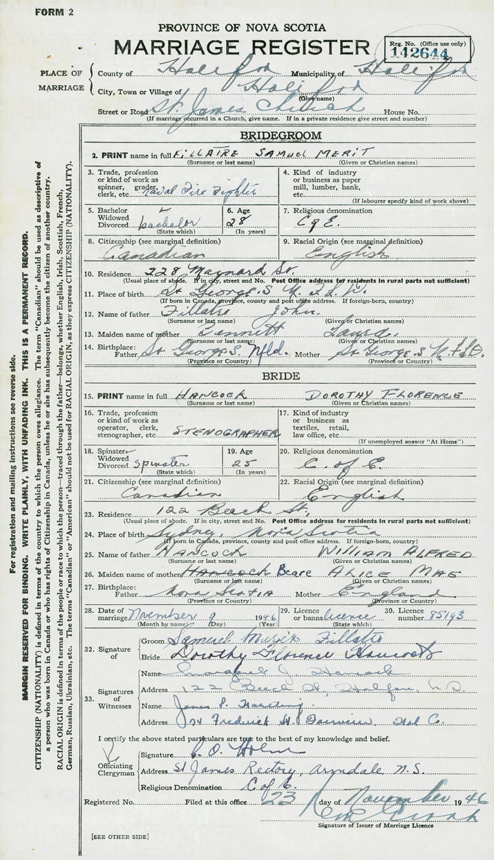 28. Date of marriage November 9 1946 29. By license or banns License 30. License number 85193