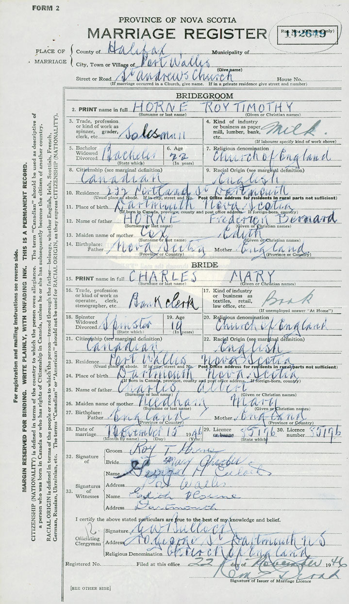 28. Date of marriage November 15 1946 29. By license or banns License 30. License number 85176