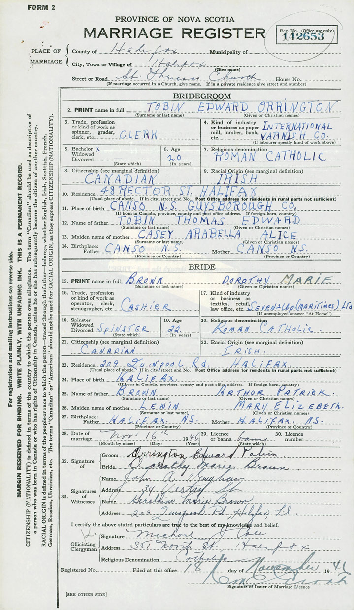 28. Date of marriage November 16 1946 29. By license or banns Banns 30. License number Banns