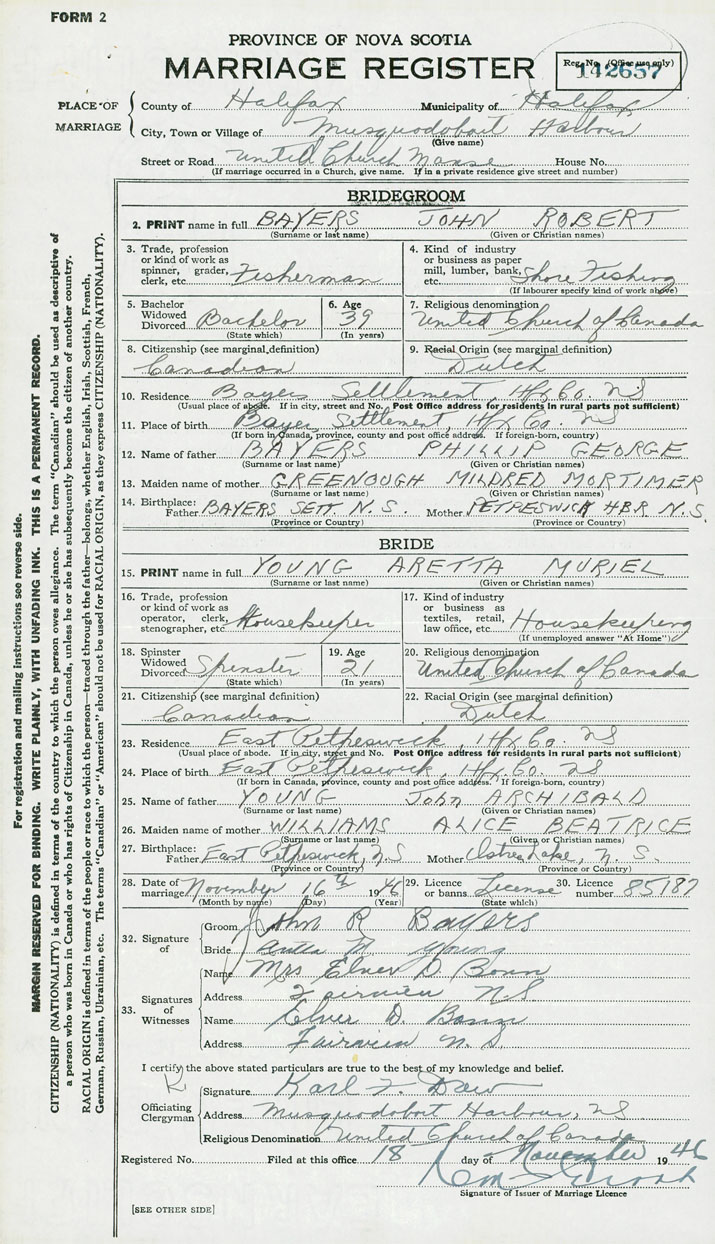 28. Date of marriage November 16 1946 29. By license or banns License 30. License number 85187