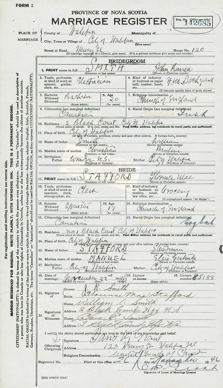 28. Date of marriage November 22 1946 29. By license or banns License 30. License number 85188