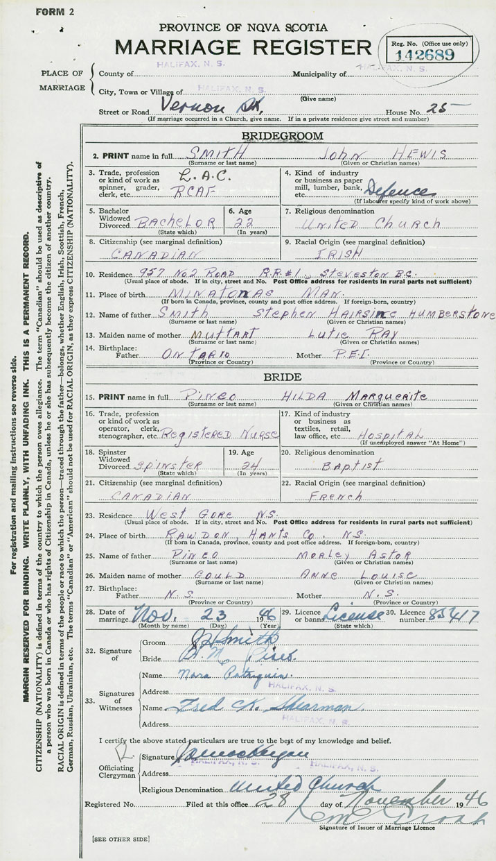 28. Date of marriage November 23 1946 29. By license or banns License 30. License number 85417