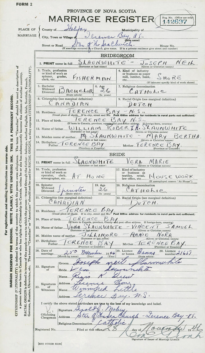 14. Birthplace Father Terence Bay Mother Terence Bay