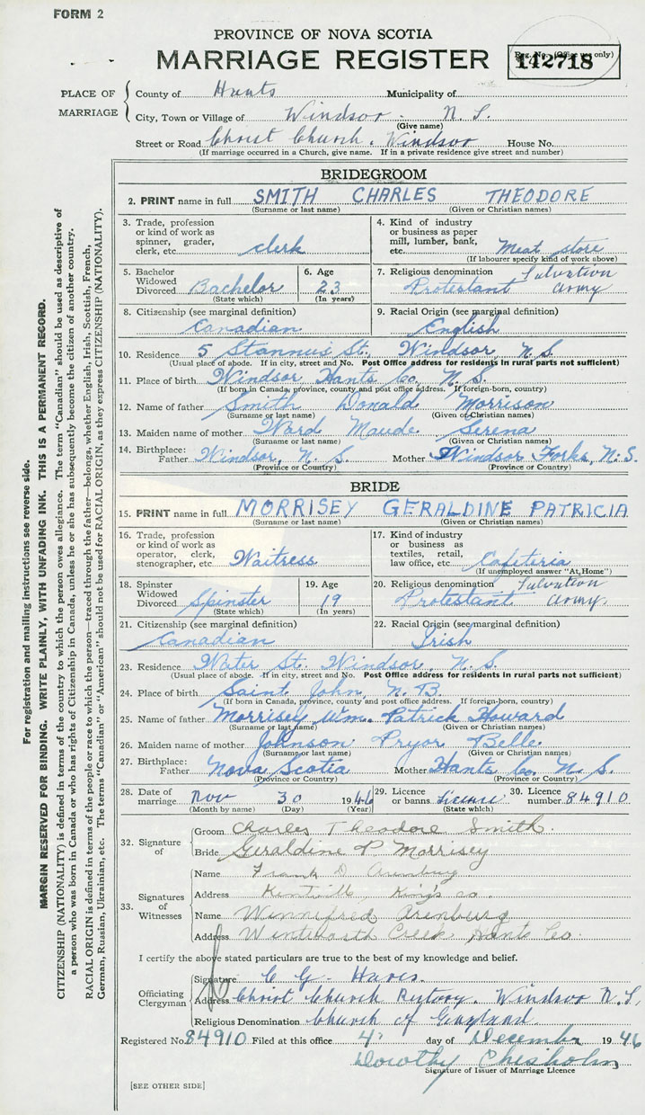28. Date of marriage November 30 1946 29. By license or banns License 30. License number 84910