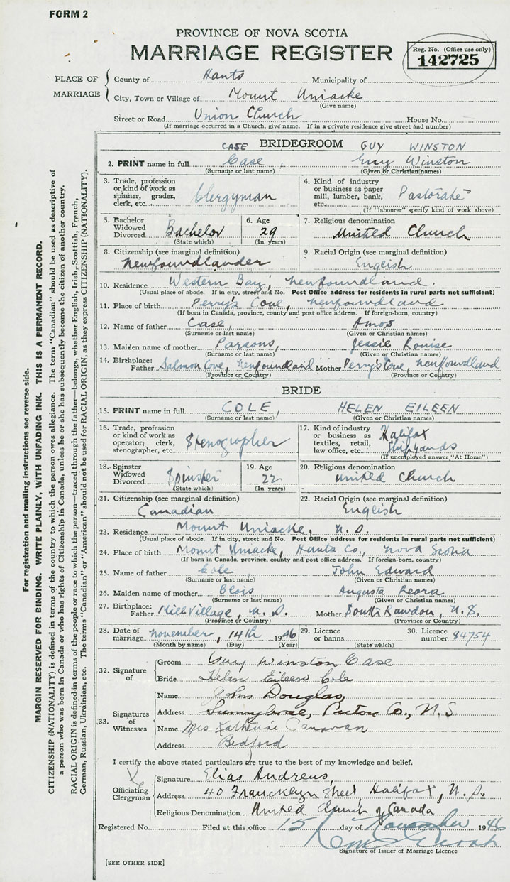 28. Date of marriage November 14 1946 29. By license or banns License 30. License number 84754