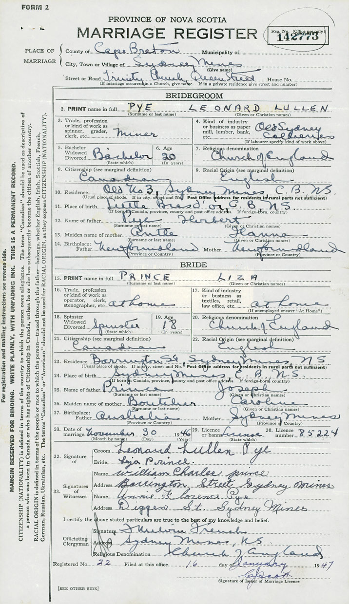 28. Date of marriage November 30 1946 29. By license or banns License 30. License number 85224