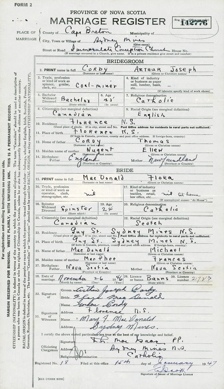 28. Date of marriage November 26 1946 29. By license or banns License 30. License number Banns 21723