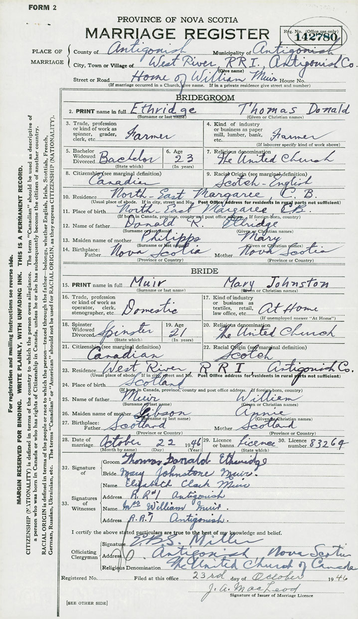 28. Date of marriage October 22 1946 29. By license or banns License 30. License number 83264