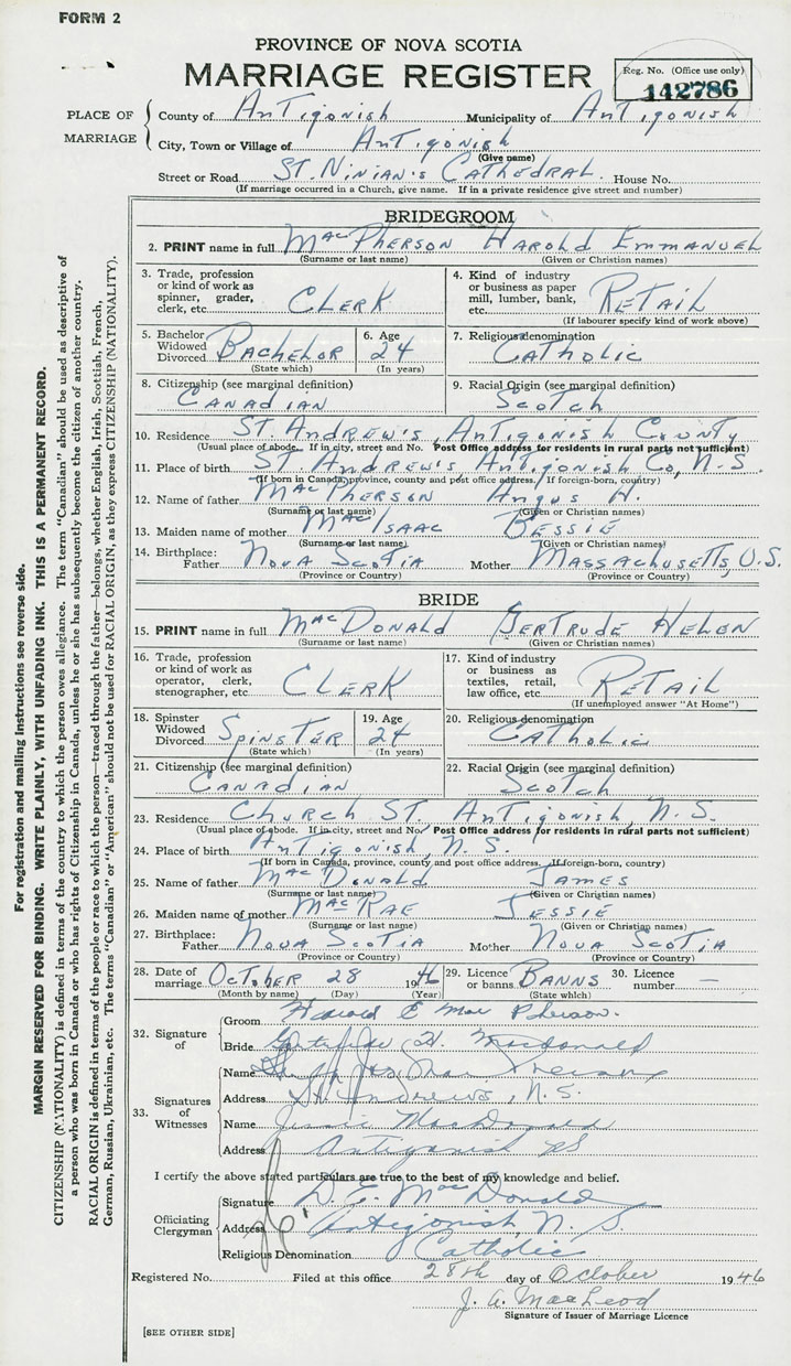 28. Date of marriage October 28 1946 29. By license or banns License 30. License number