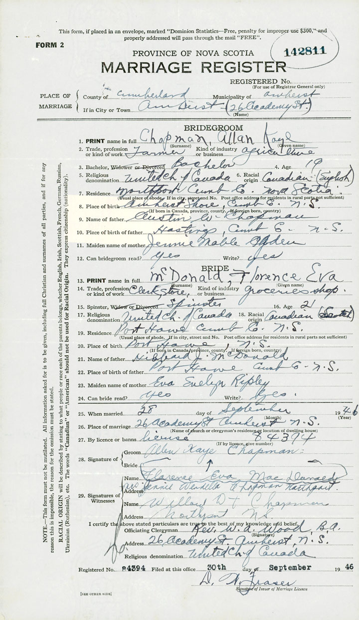 26. Place of marriage 26 Academy St. Amherst, Cumberland County