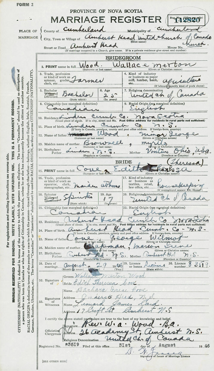 28. Date of marriage August 29 1946 29. By license or banns License 30. License number 83519