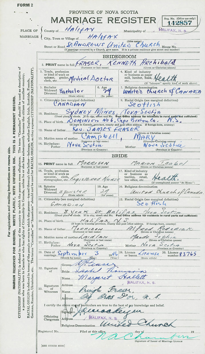 28. Date of marriage September 3 1946 29. By license or banns License 30. License number 83765