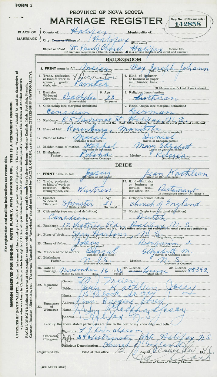 28. Date of marriage November 16 1946 29. By license or banns License 30. License number 85392