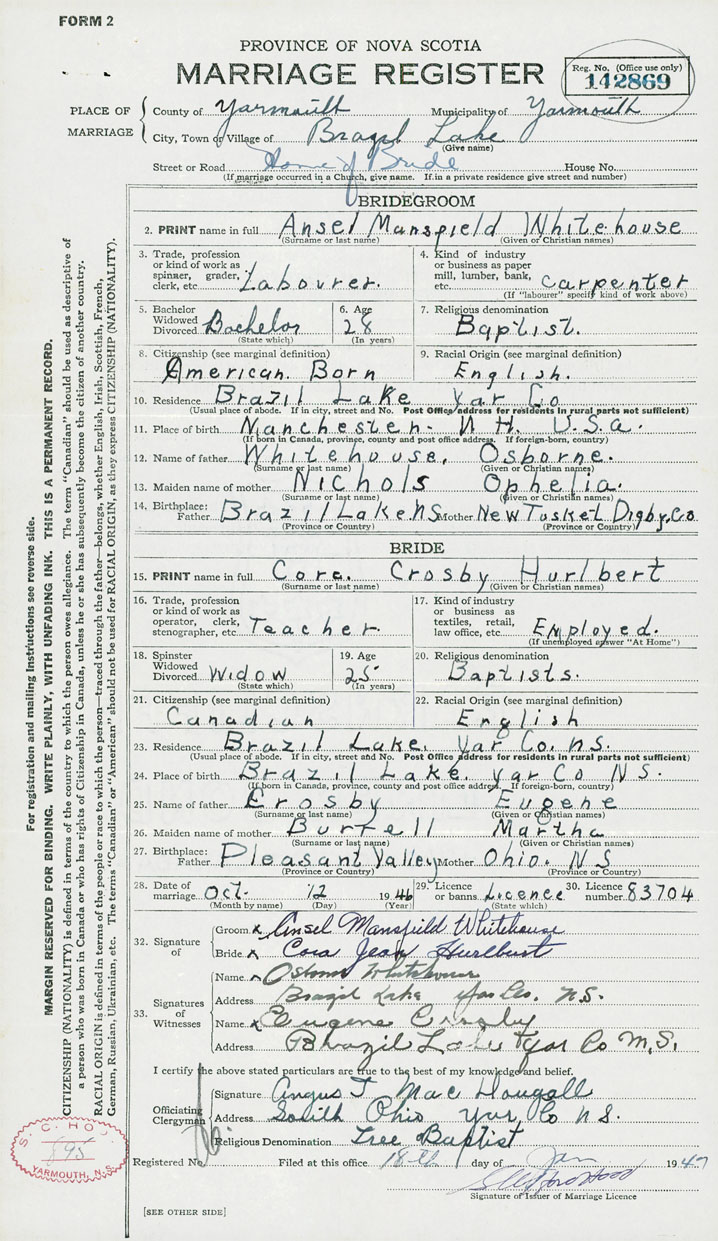 14. Birthplace Father Brazil Lake Yar Mother New Tusket Digby