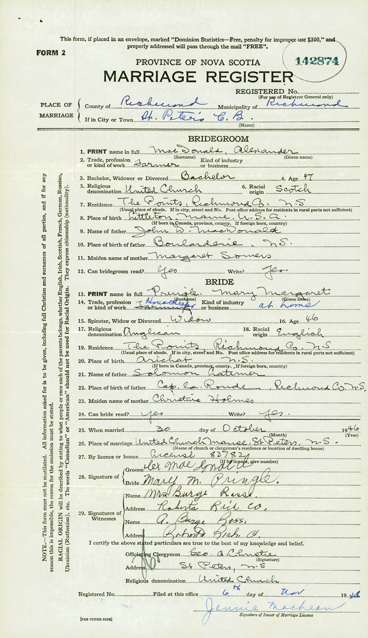 26. Place of marriage United Church Manse St. Peters, Richmond County