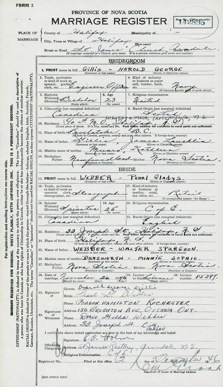 28. Date of marriage November 26 1946 29. By license or banns License 30. License number 85397