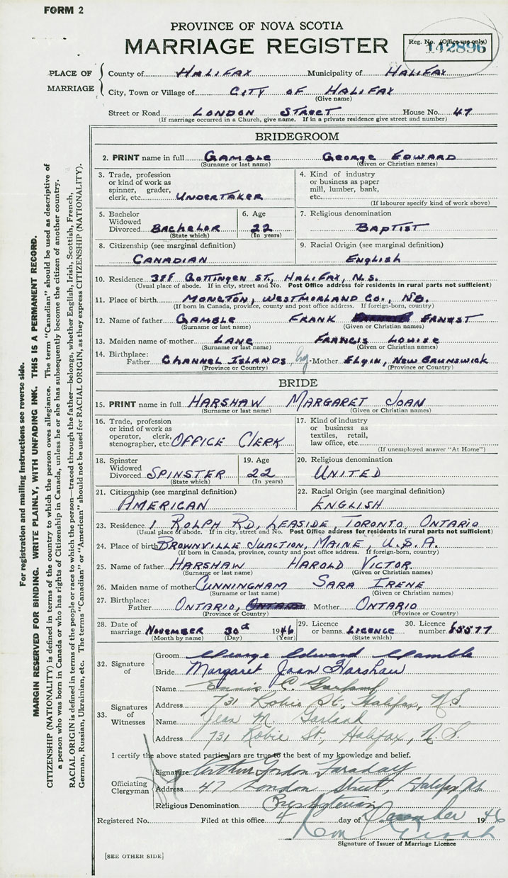 28. Date of marriage November 30 1946 29. By license or banns License 30. License number 85577