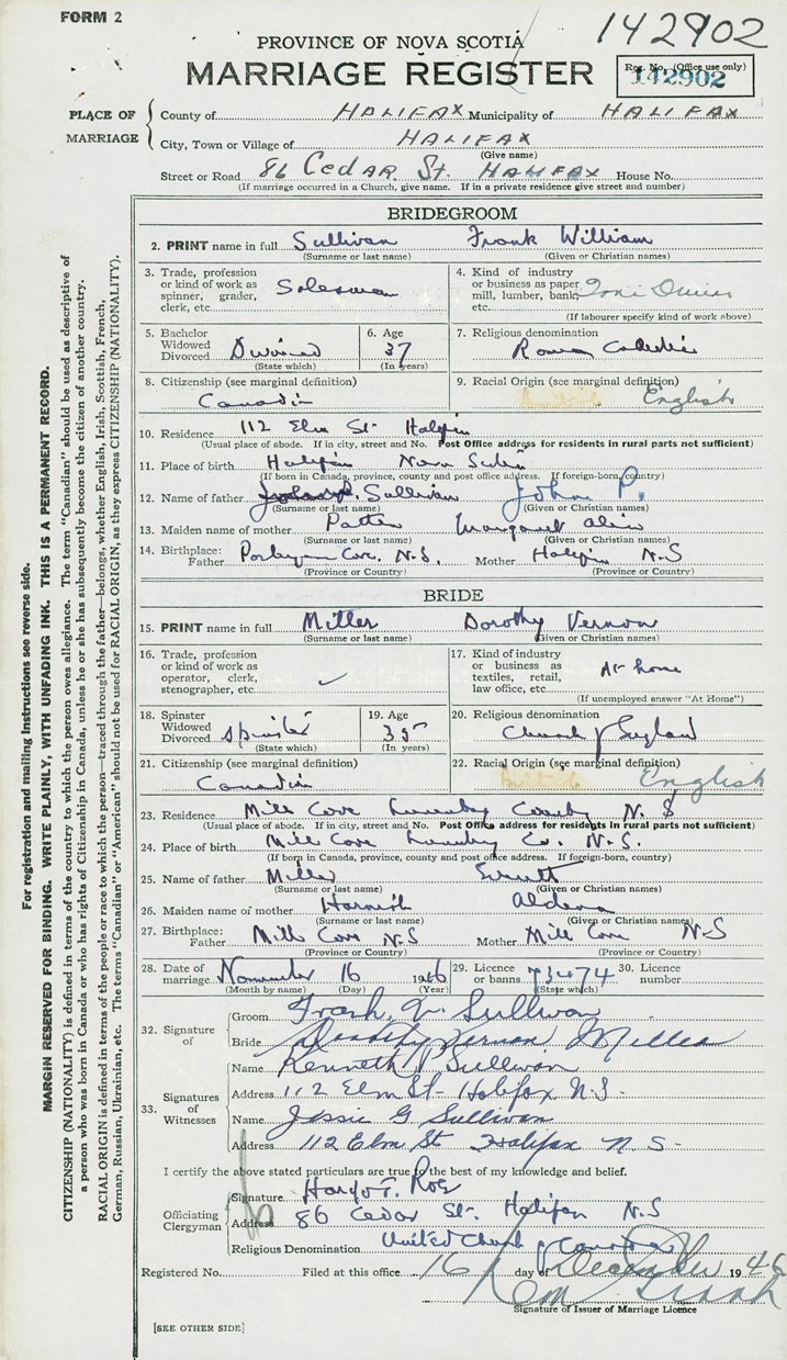 28. Date of marriage November 16 1946 29. By license or banns License 30. License number 73474