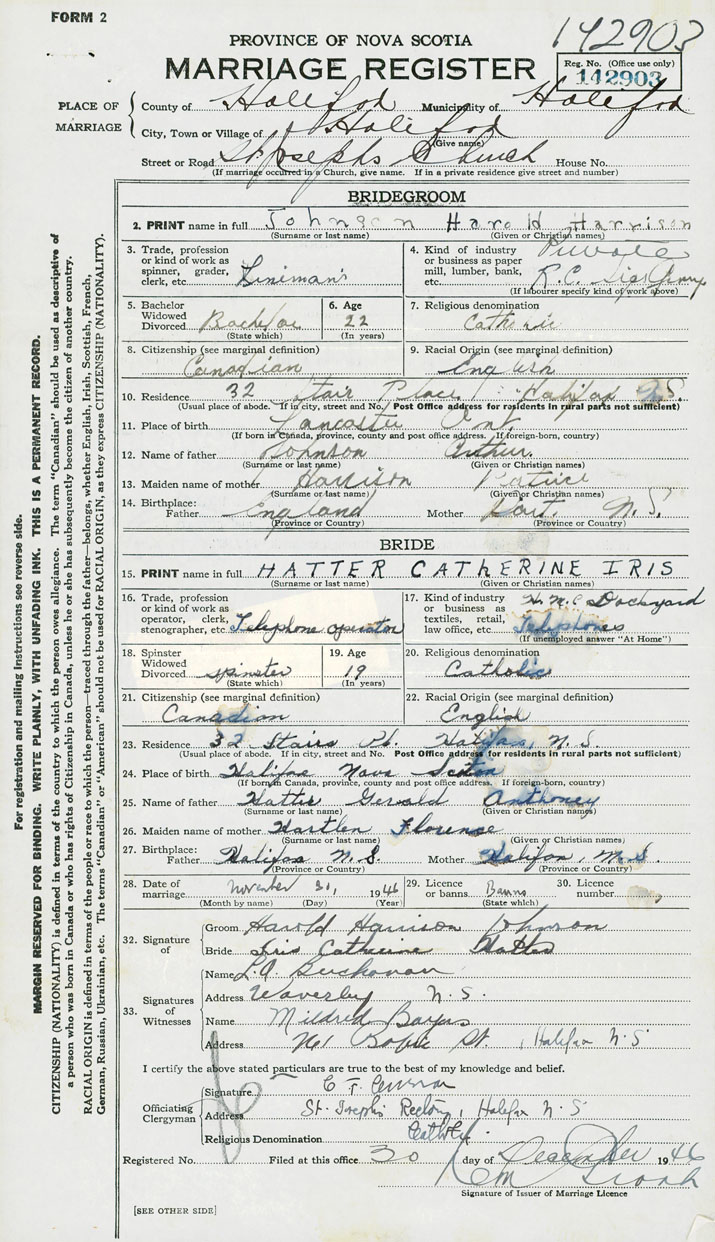28. Date of marriage November 30 1946 29. By license or banns Banns 30. License number Banns