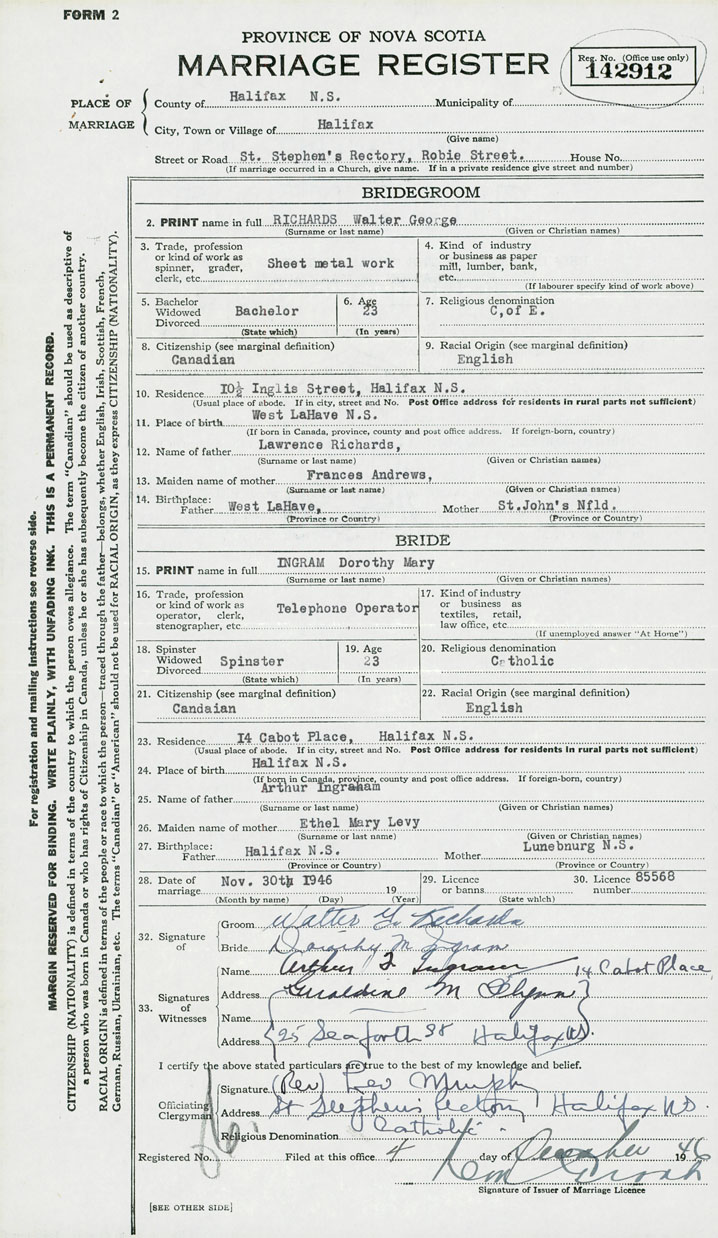 28. Date of marriage November 30 1946 29. By license or banns License 30. License number 85568