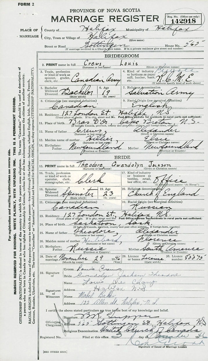 28. Date of marriage November 29 1946 29. By license or banns License 30. License number 85575