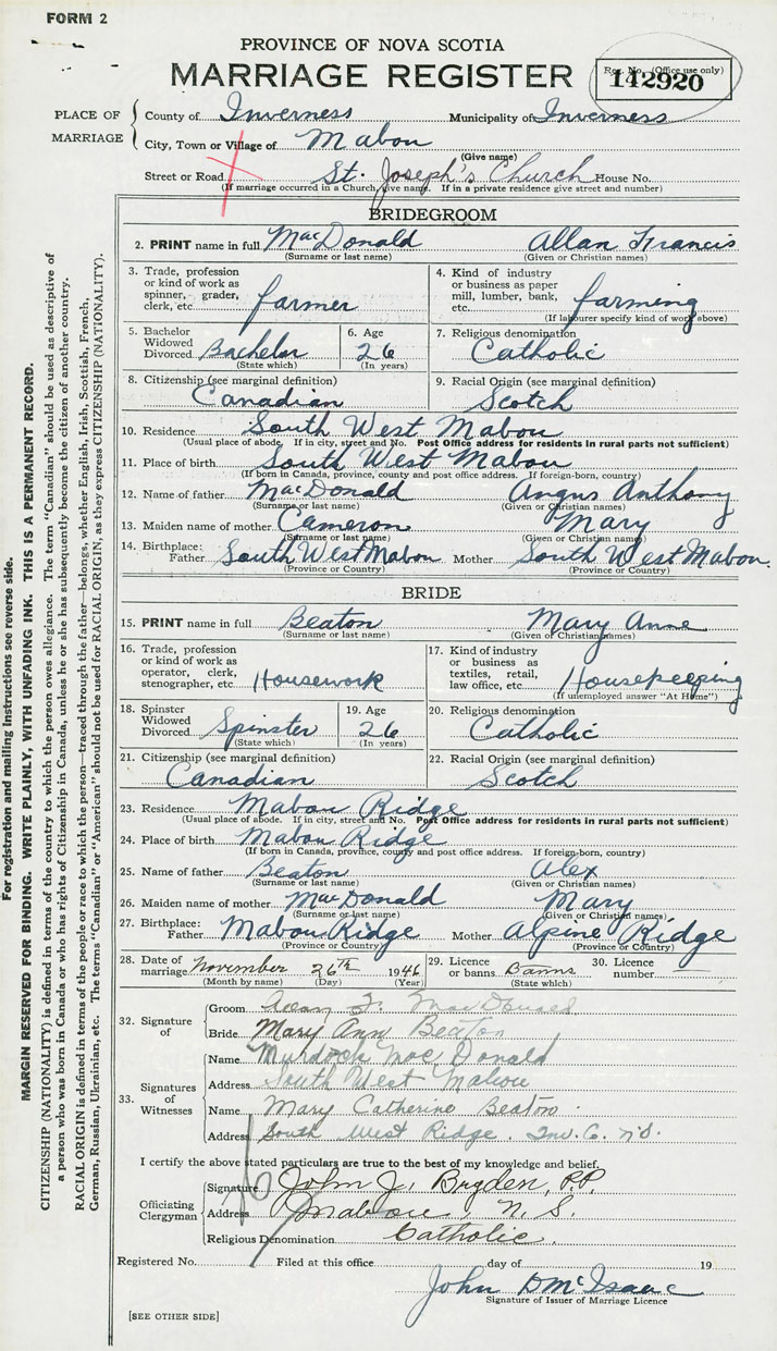 28. Date of marriage November 26 1946 29. By license or banns License 30. License number