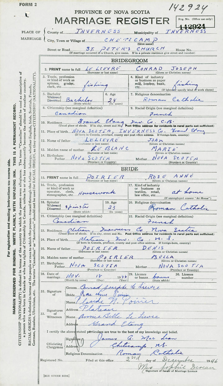 28. Date of marriage November 18 1946 29. By license or banns Banns 30. License number Banns