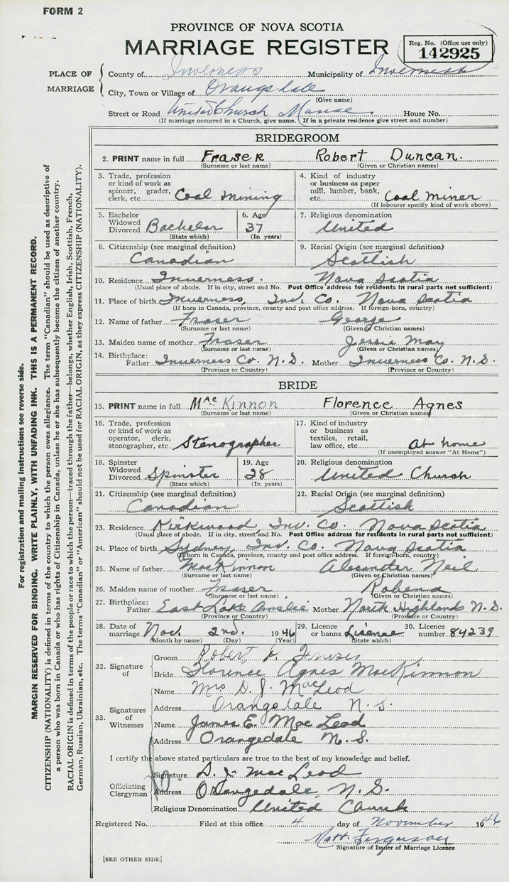 28. Date of marriage November 2 1946 29. By license or banns License 30. License number 84239