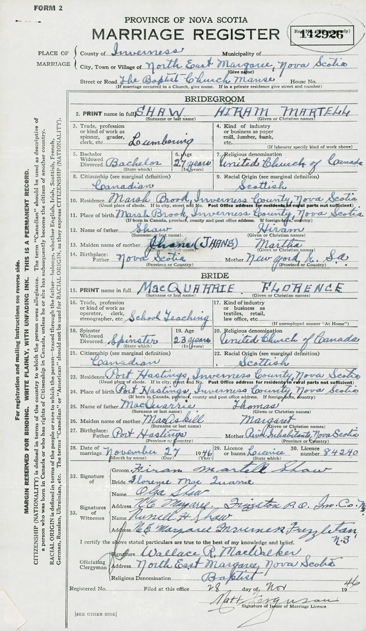 28. Date of marriage November 27 1946 29. By license or banns License 30. License number 84240