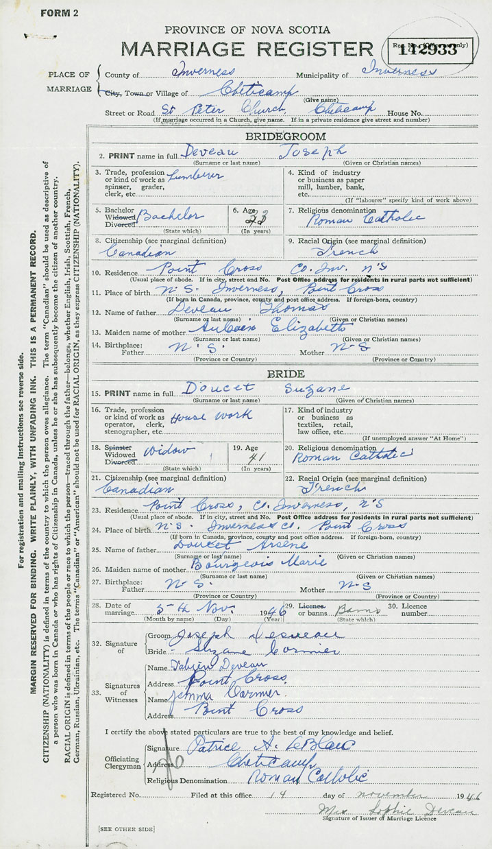 28. Date of marriage November 5 1946 29. By license or banns License 30. License number