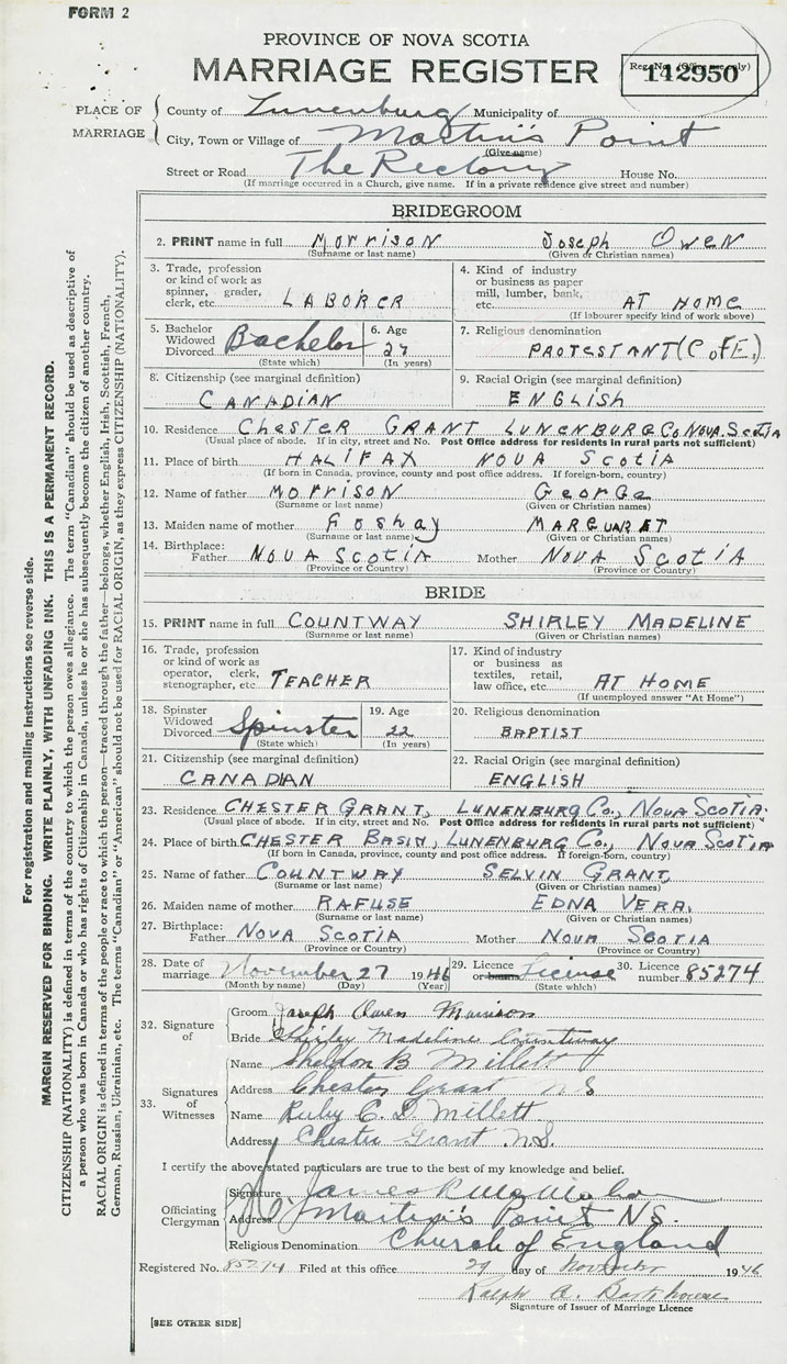 28. Date of marriage November 27 1946 29. By license or banns License 30. License number 85274