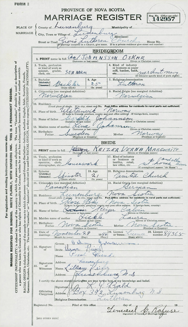 28. Date of marriage December 28 1946 29. By license or banns License 30. License number 84365