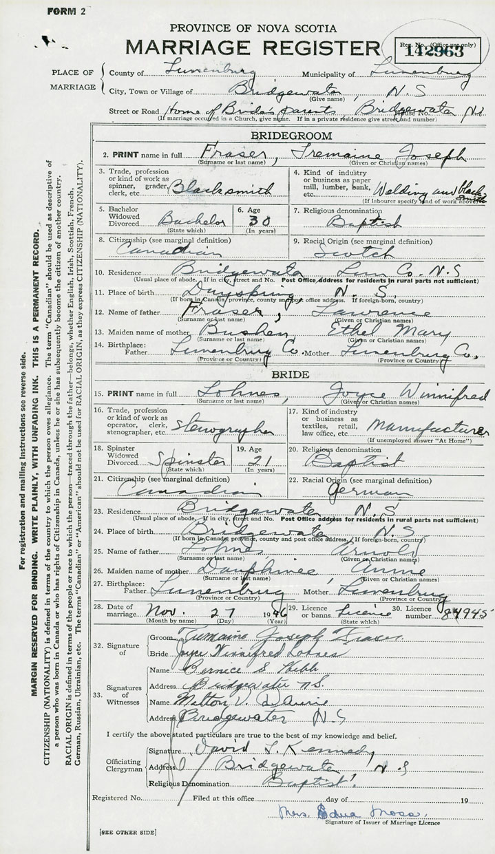 28. Date of marriage November 27 1946 29. By license or banns License 30. License number 84945