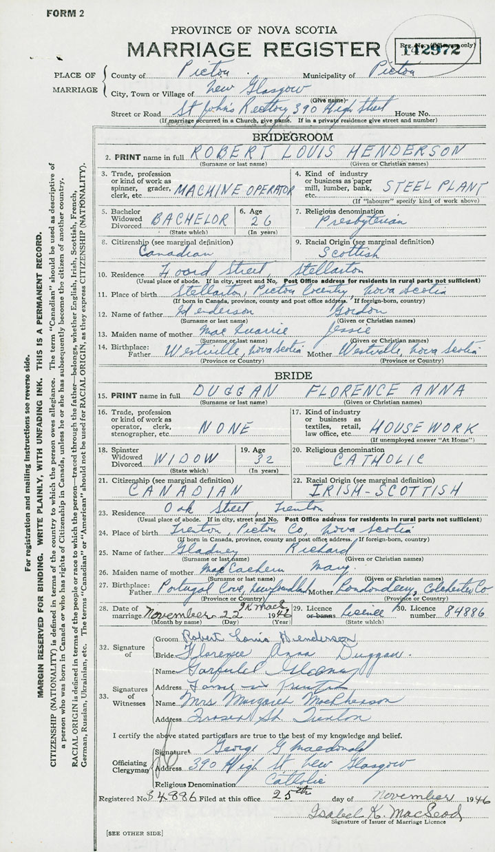 28. Date of marriage November 22 1946 29. By license or banns License 30. License number 84886