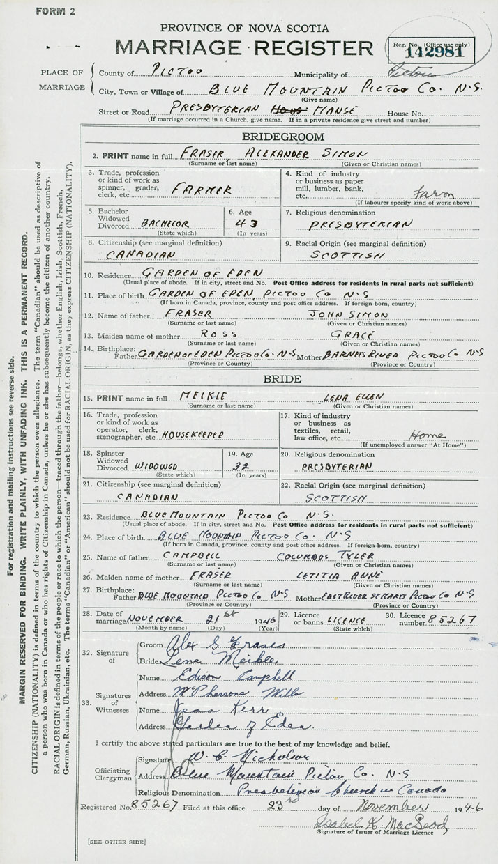 27. Birthplace Father Blue Mountain, Pictou County Mother East River St. Mary's, Pictou County