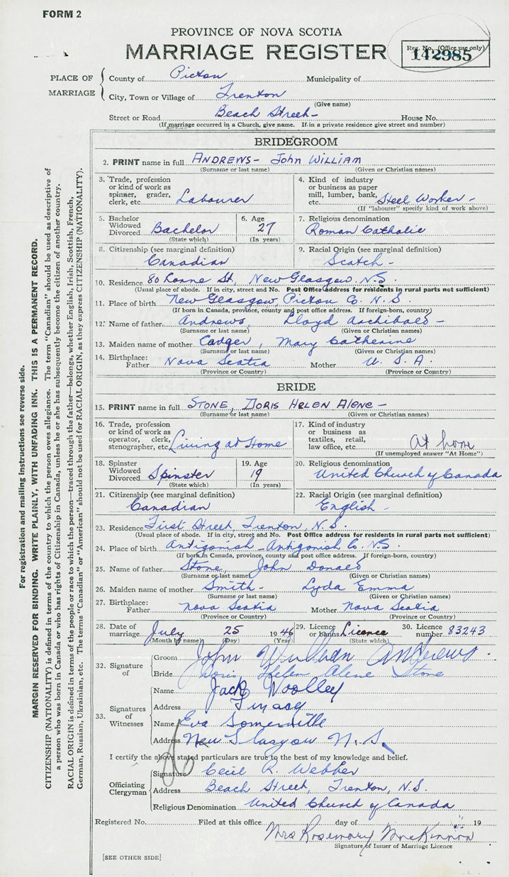 28. Date of marriage July 25 1946 29. By license or banns License 30. License number 83243