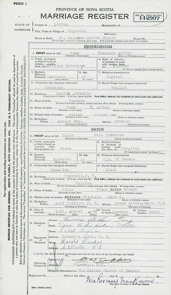28. Date of marriage August 14 1946 29. By license or banns License 30. License number 83455