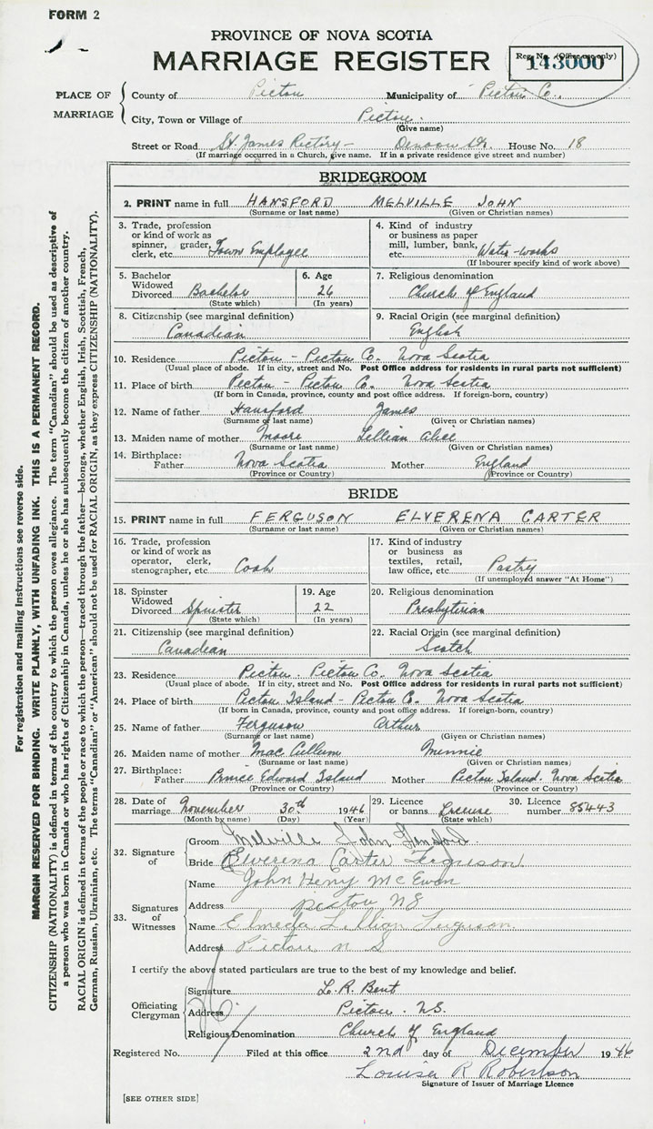 28. Date of marriage November 30 1946 29. By license or banns License 30. License number 85443
