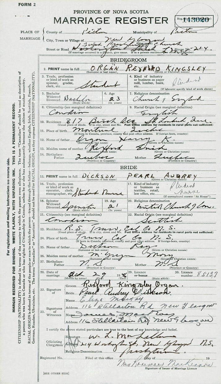 28. Date of marriage October 29 1946 29. By license or banns License 30. License number 85137