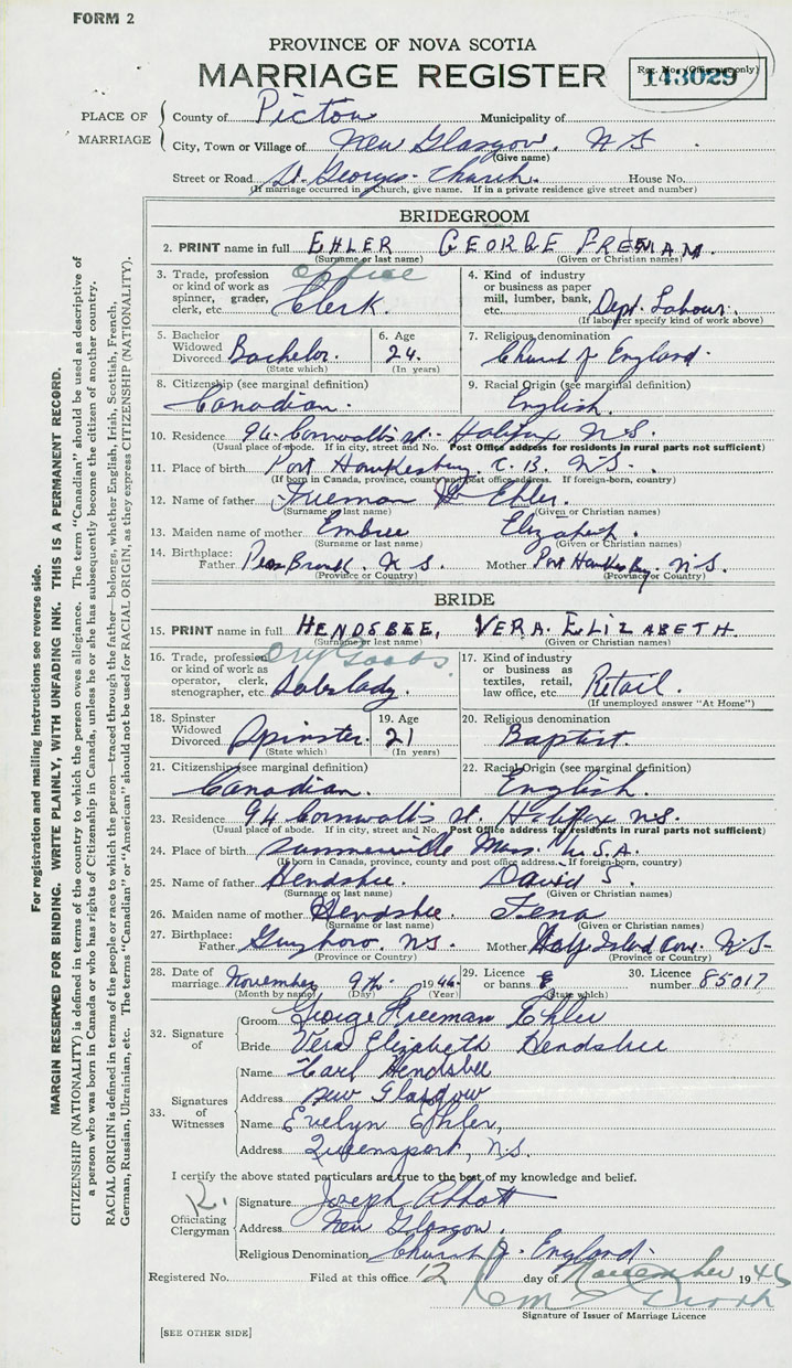 28. Date of marriage November 9 1946 29. By license or banns License 30. License number 85017