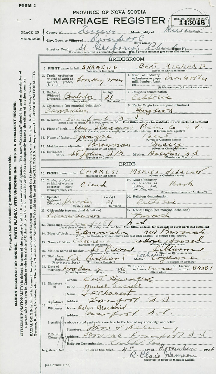28. Date of marriage November 4 1946 29. By license or banns License 30. License number 84281