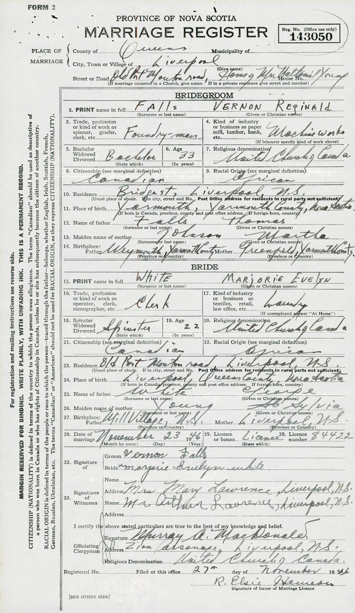 28. Date of marriage November 23 1946 29. By license or banns License 30. License number 84422