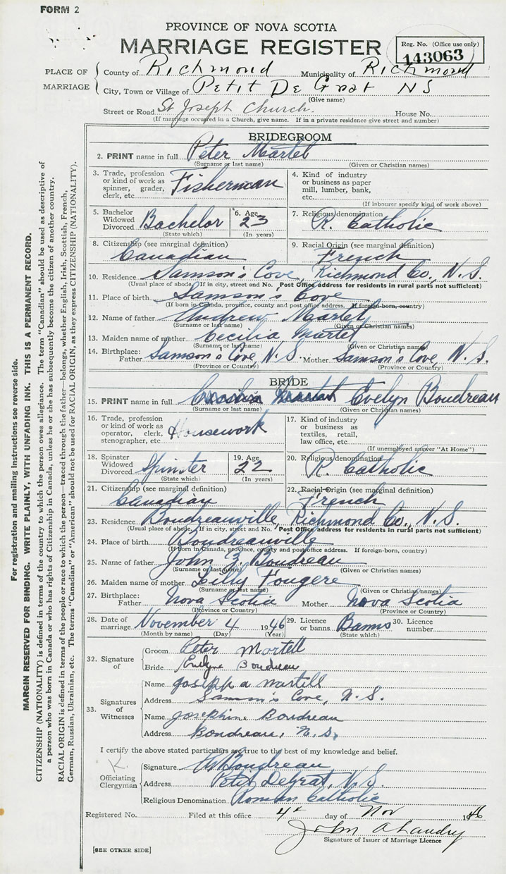 14. Birthplace Father Samson's Cove, Richmond County Mother Samson's Cove, Richmond County