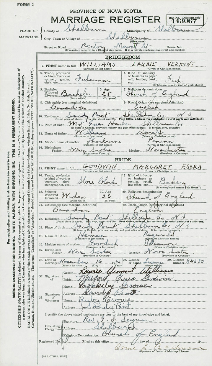 28. Date of marriage November 16 1946 29. By license or banns License 30. License number 84630