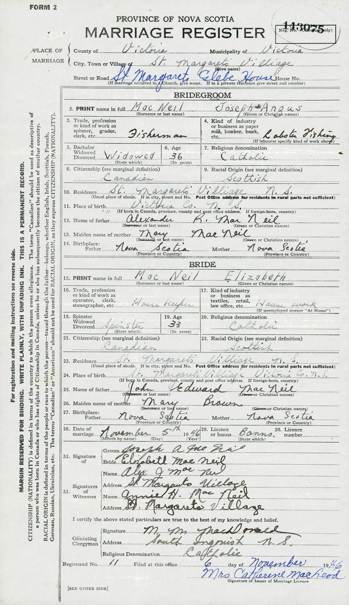 28. Date of marriage November 5 1946 29. By license or banns License 30. License number