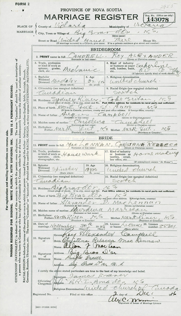 24. Place of birth Big Bras d'Or