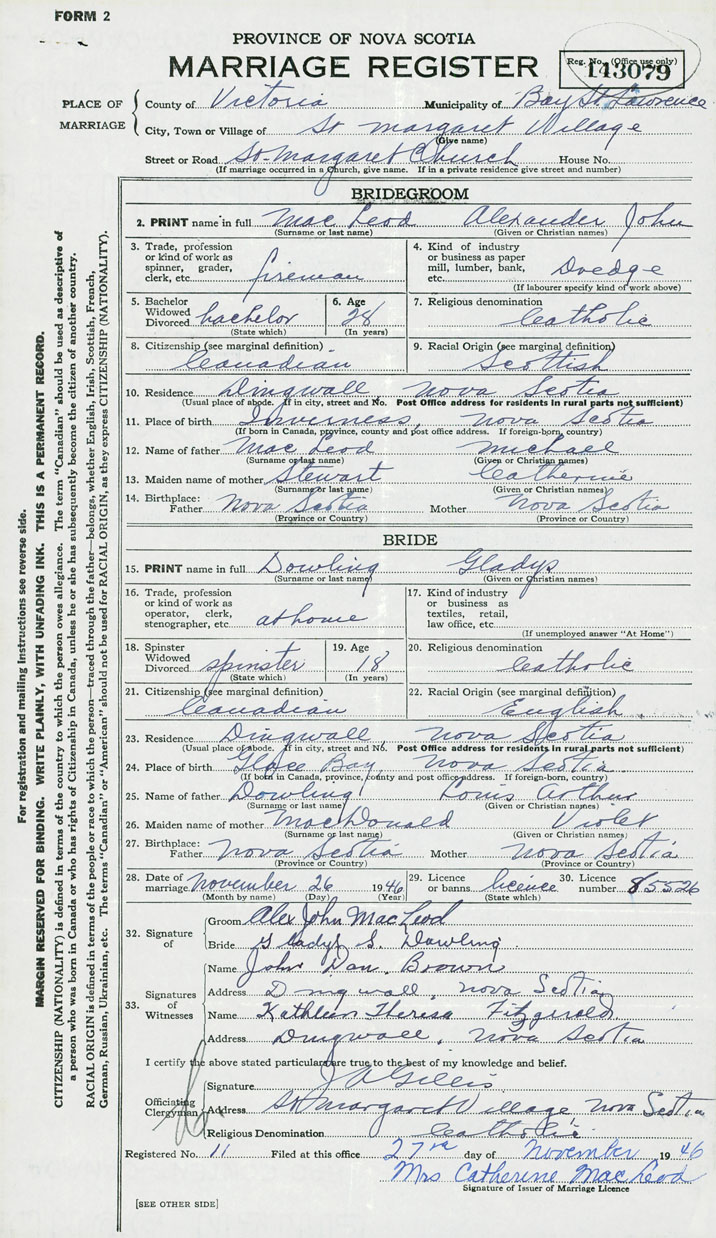 28. Date of marriage November 26 1946 29. By license or banns License 30. License number 85526