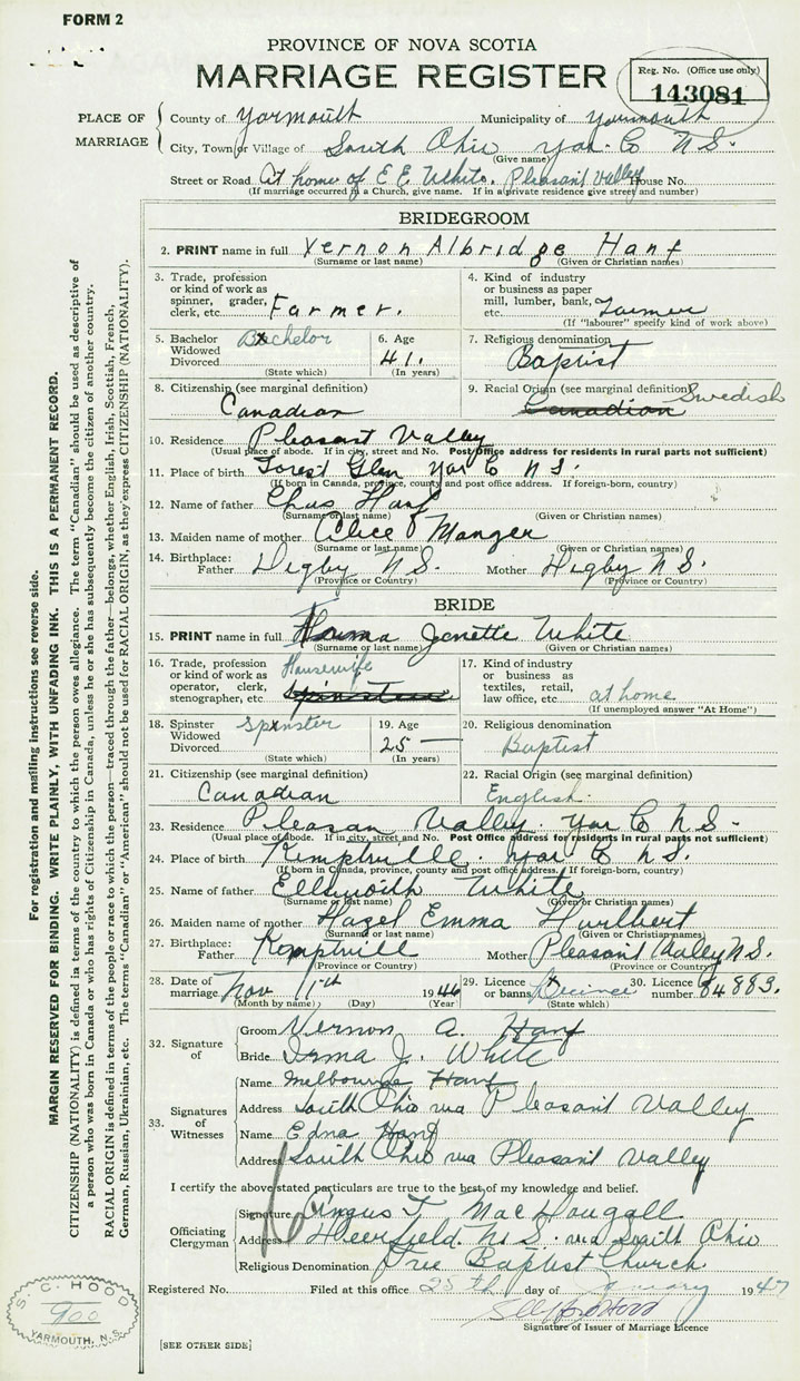 28. Date of marriage November 11 1946 29. By license or banns License 30. License number 84883