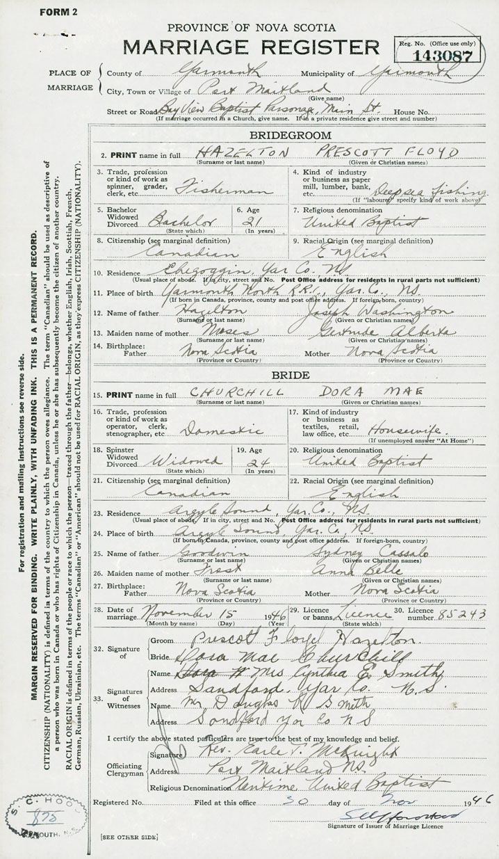 28. Date of marriage November 15 1946 29. By license or banns License 30. License number 85243